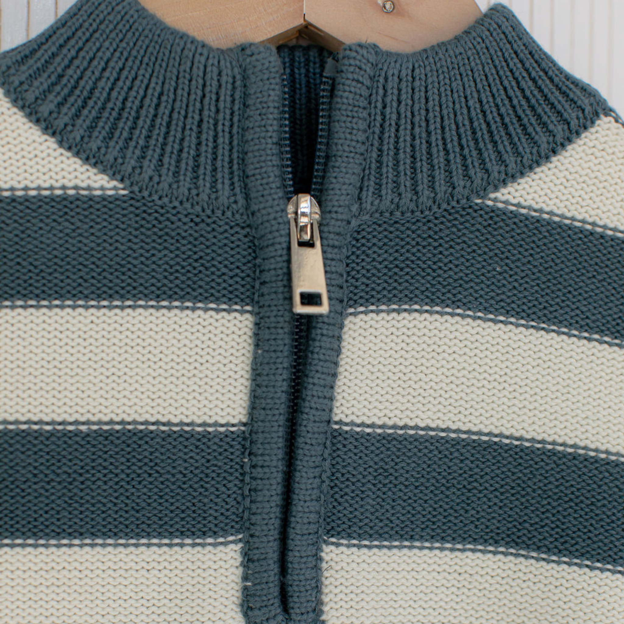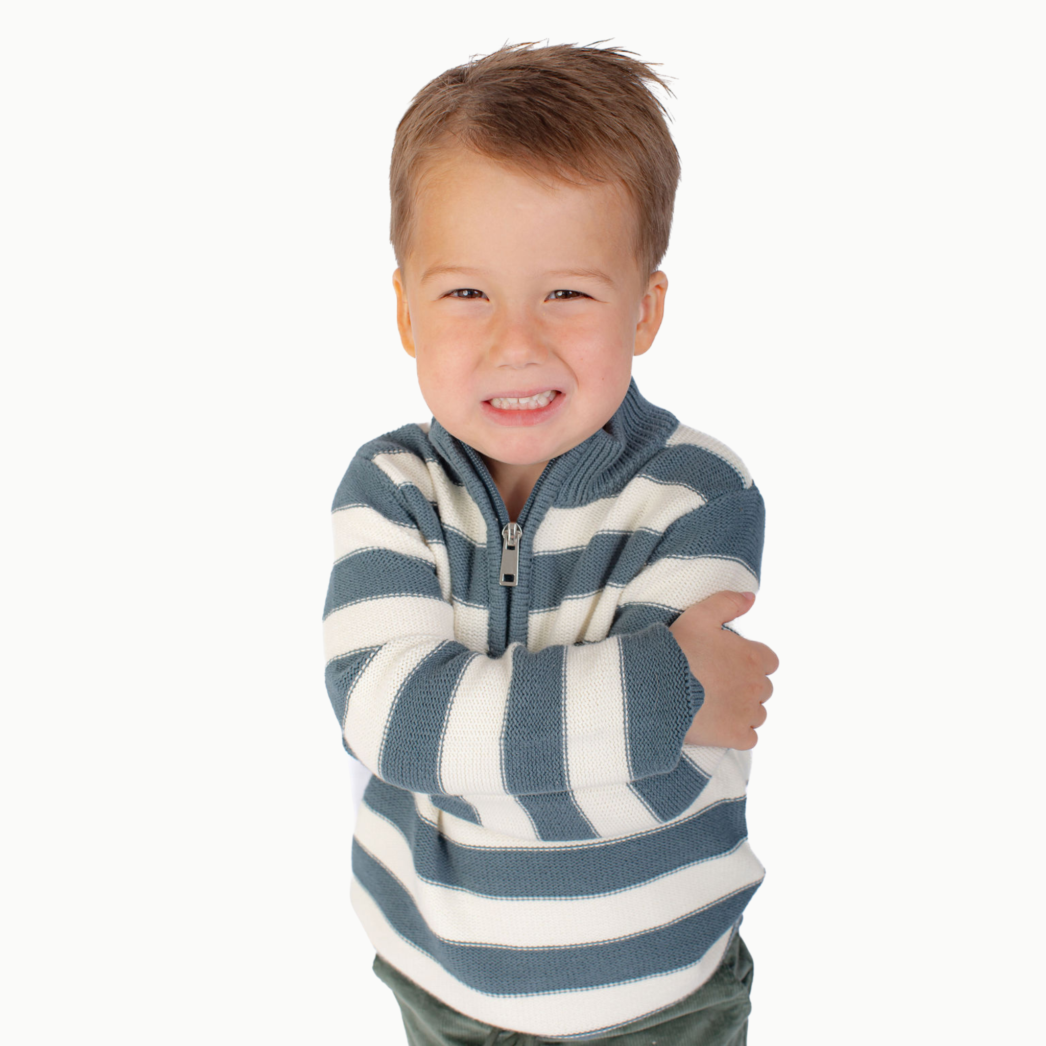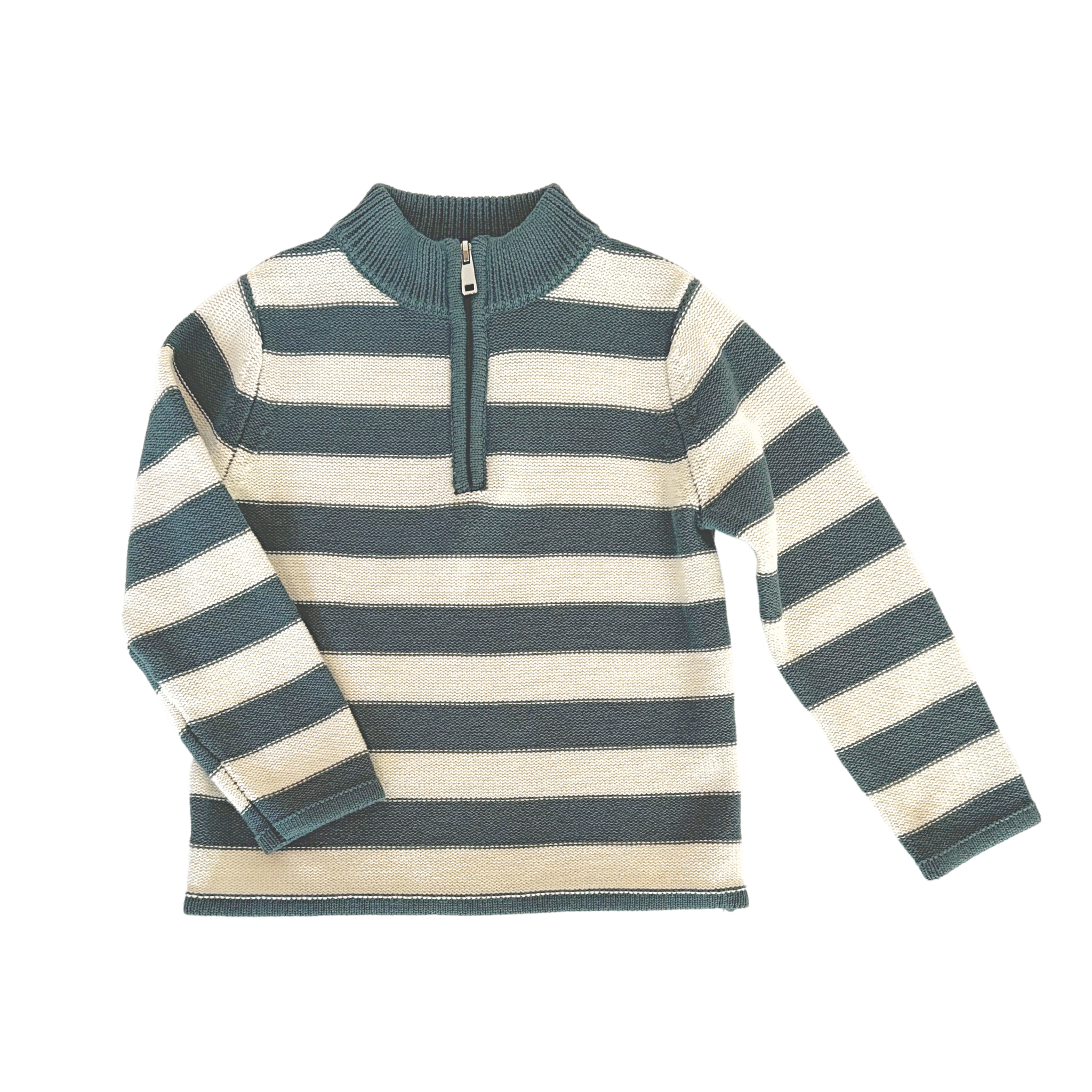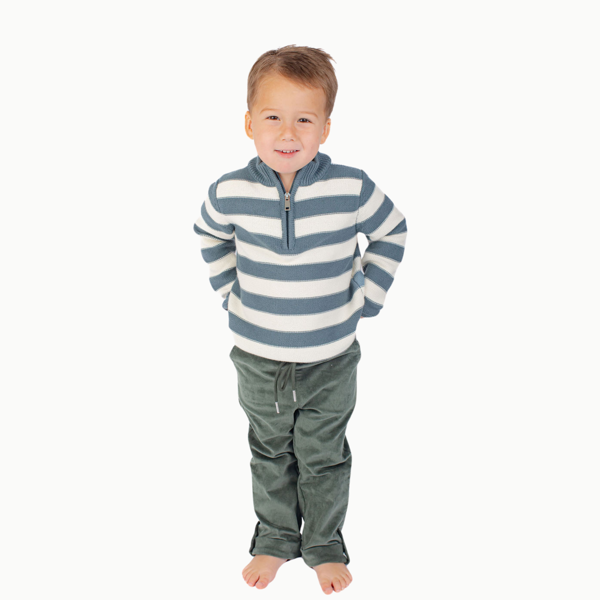 Perfect for the cooler weather, our Boy's Half Zip Sweater features a ribbed collar and contrasting stripes to make this the perfect top to pair with our Corduroy Cuff Pants and Dino Trousers.