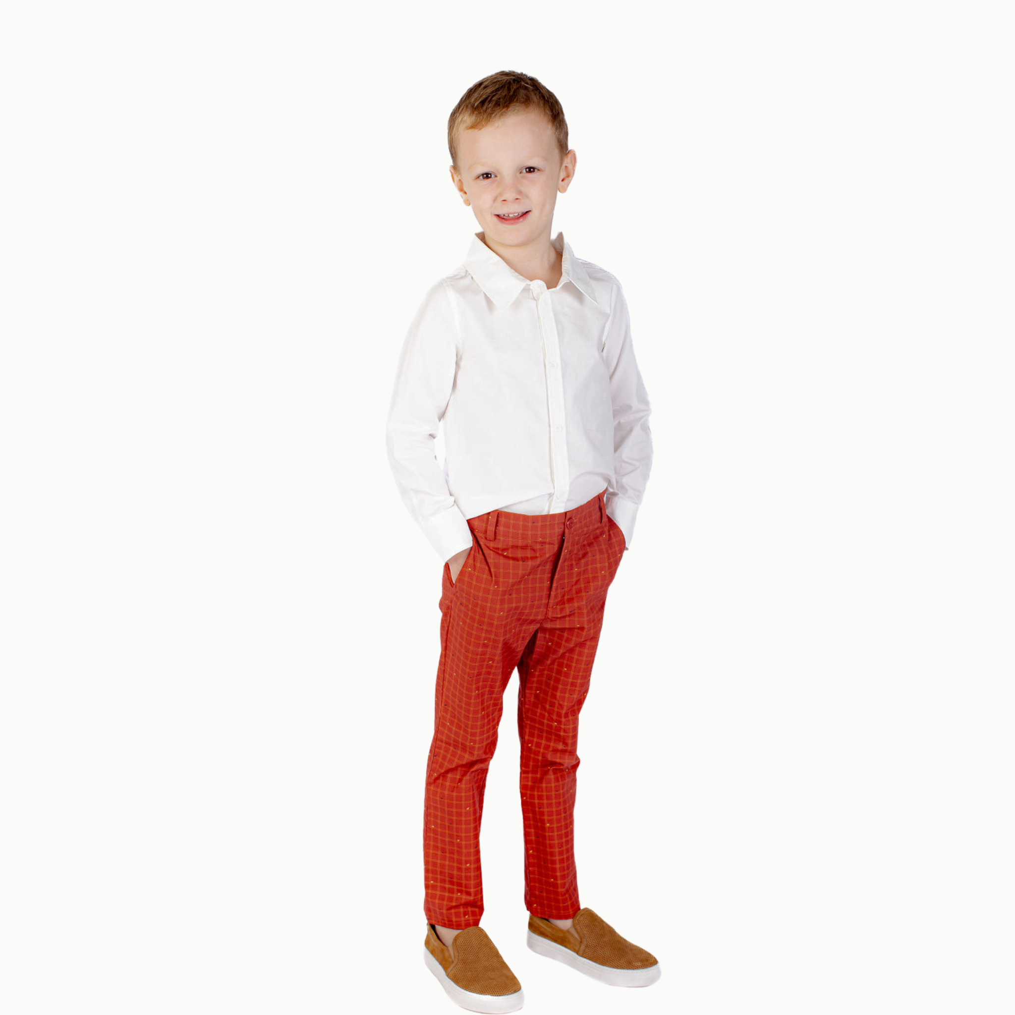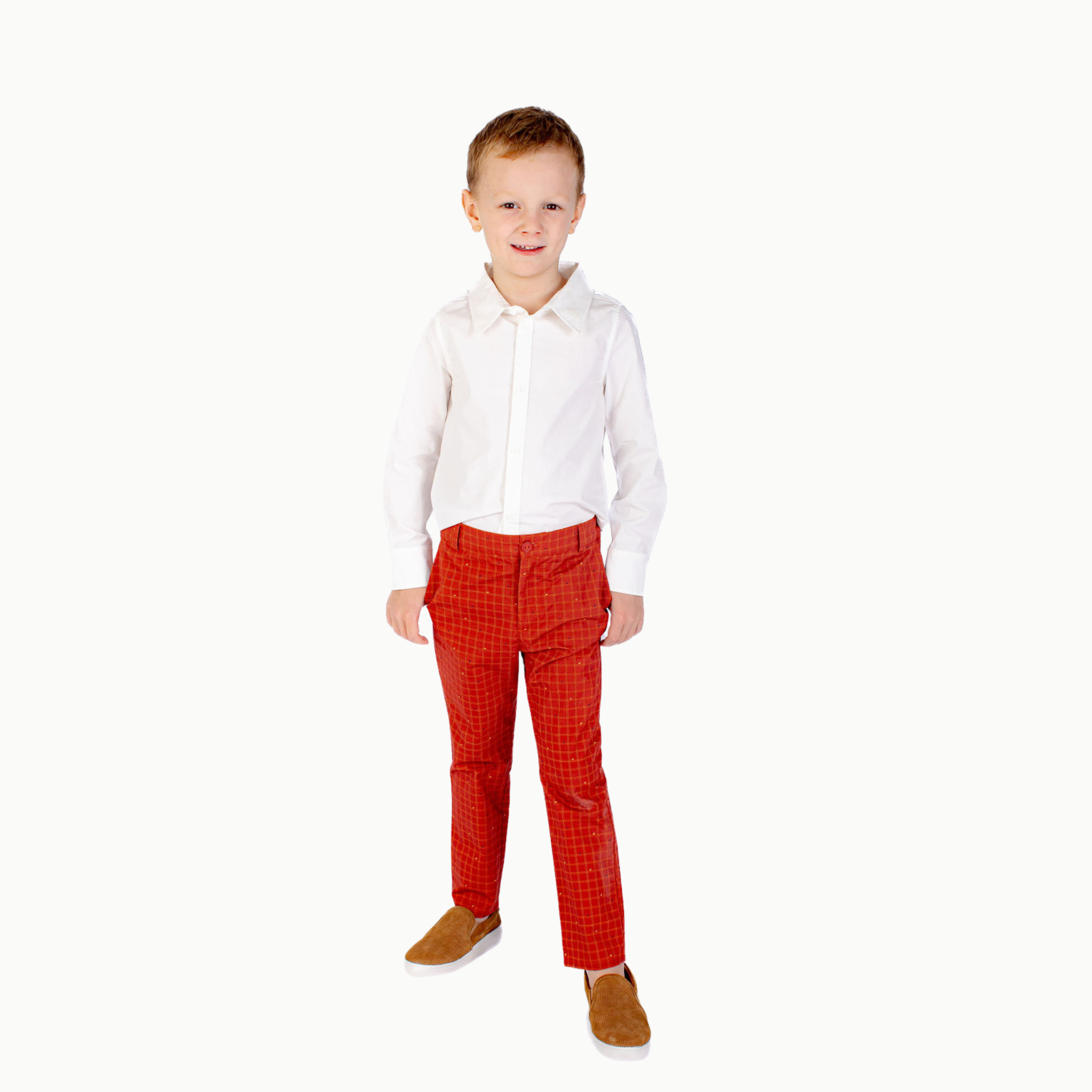 Featuring an adjustable waistband, zip fly with button, and a tapered leg, our Boys' Chinos are the perfect pant to keep your little guy looking sharp, while micro plaid stripes and tiny Dino prints add a bit of fun to this wardrobe essential.