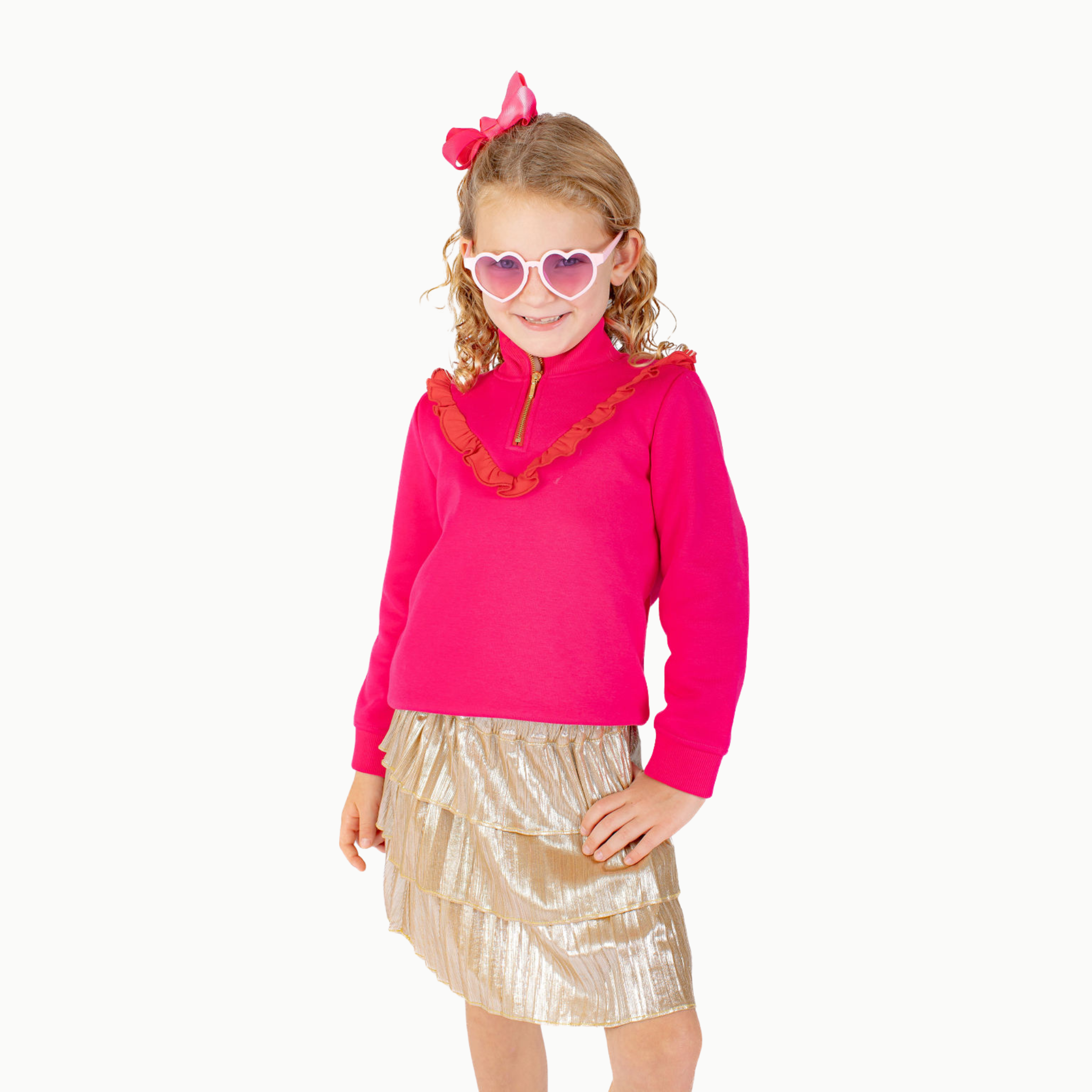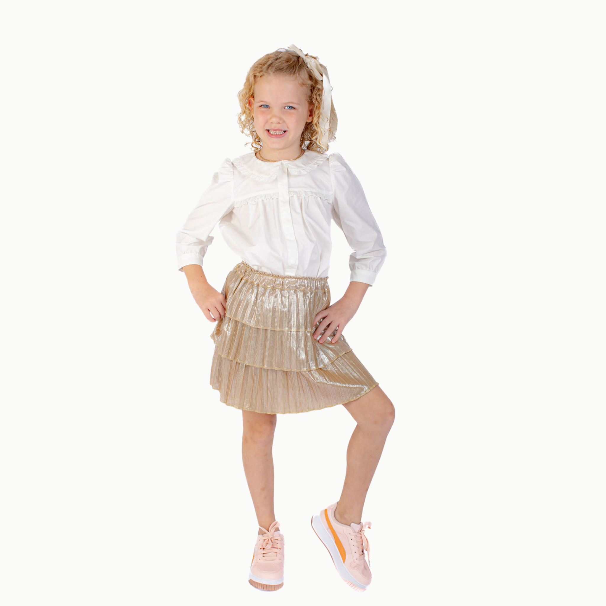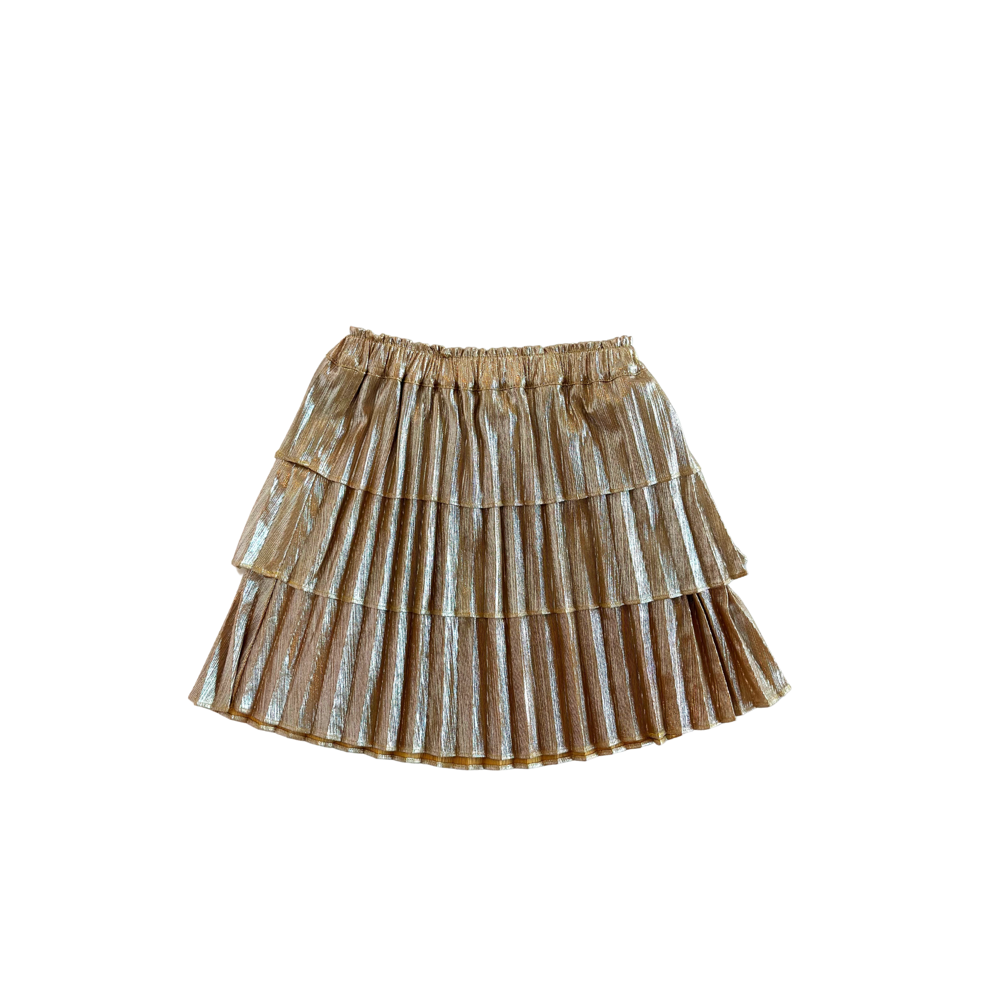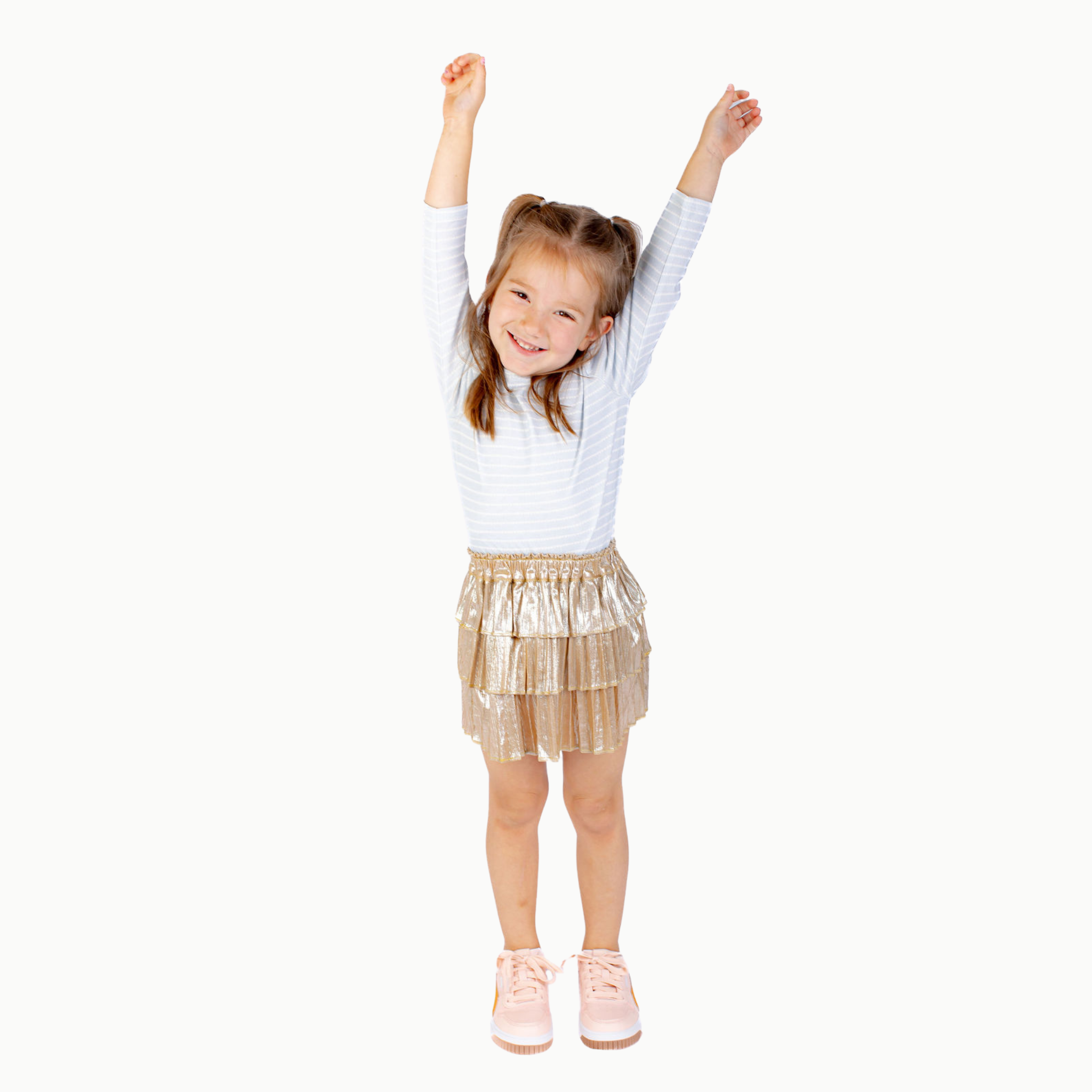3 ruffles and a pleated metallic fabric give your little one everything they could ever want in this perfect twirly skirt.