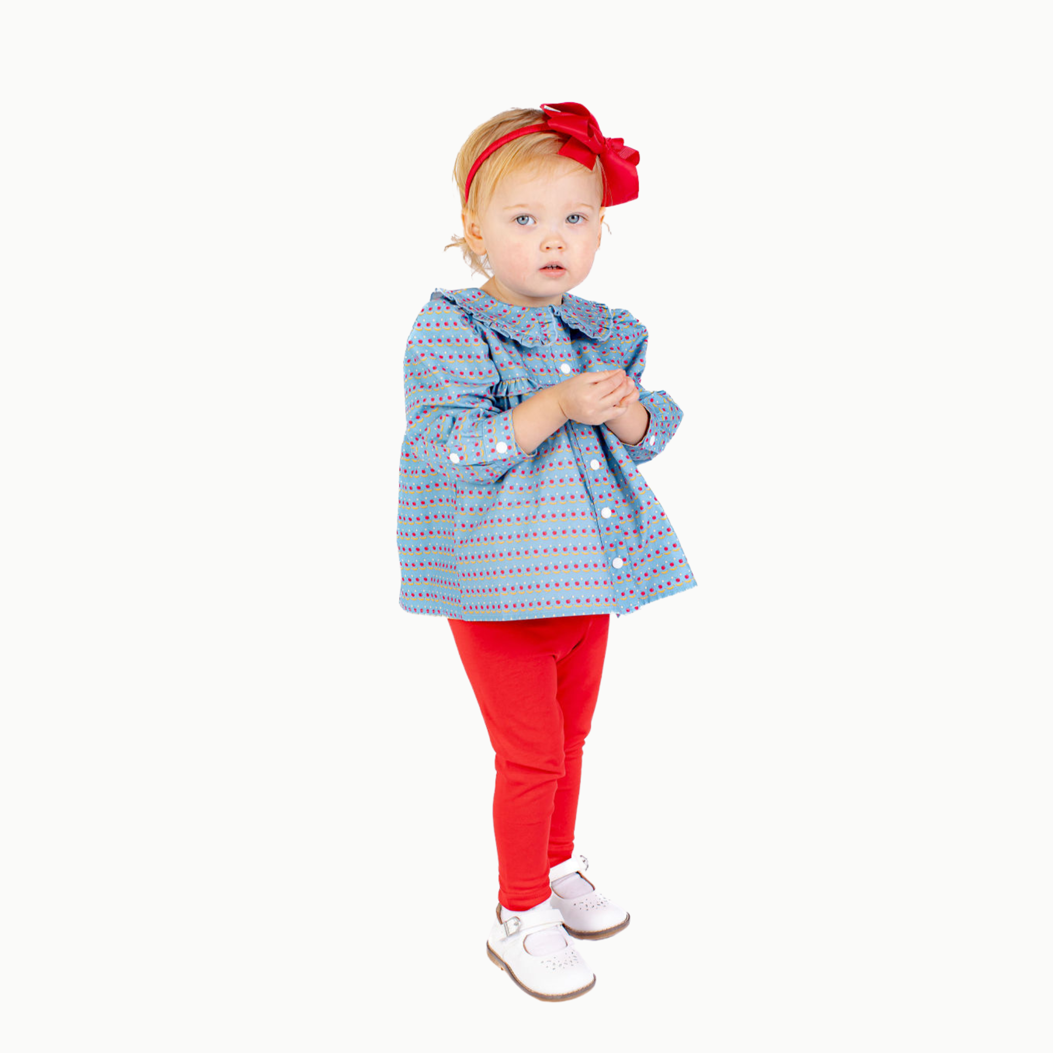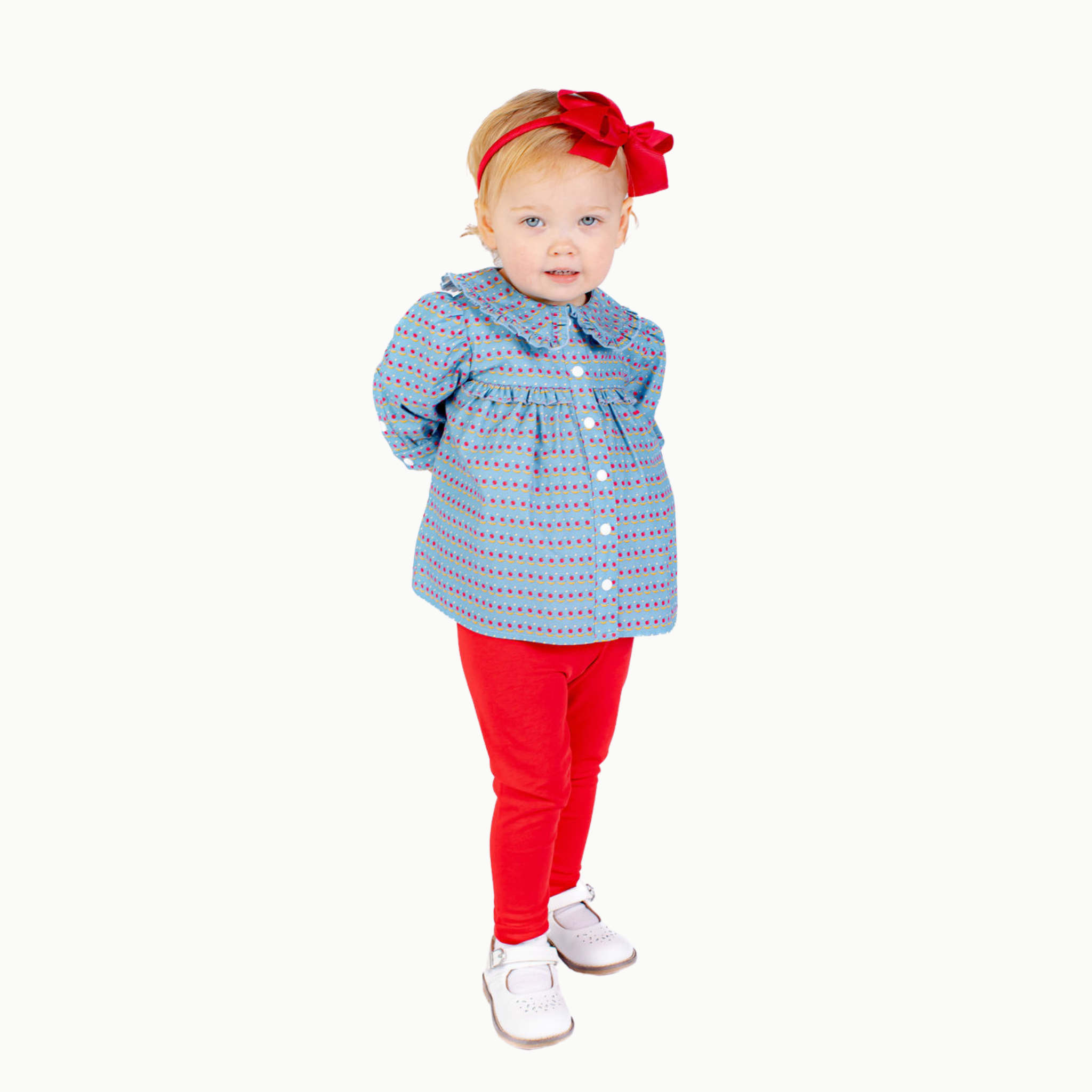 Available in 3 fun prints and a classic white, this blouse features ruffle trim along the collar, long sleeves and snaps on the front to create a timeless look for your little one.