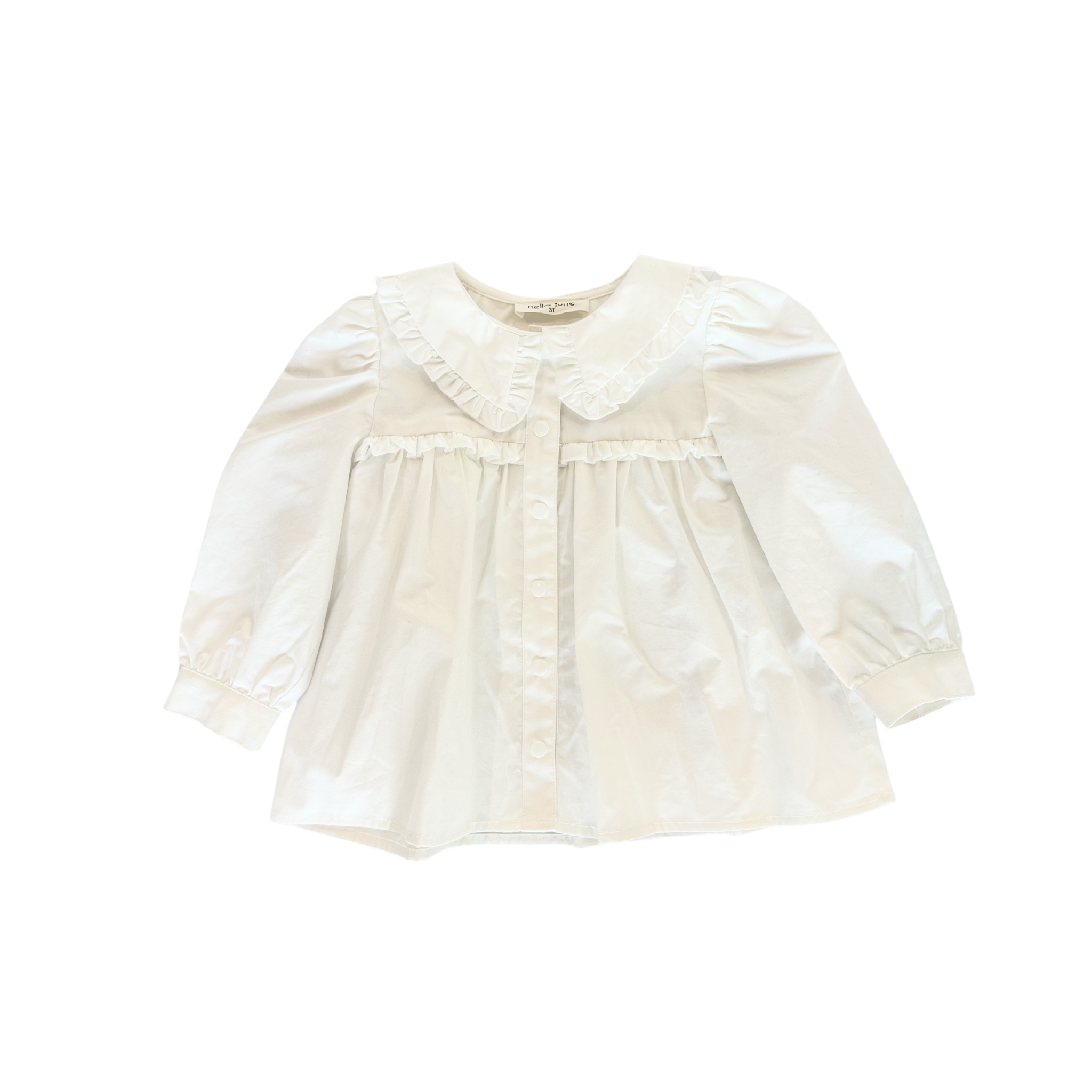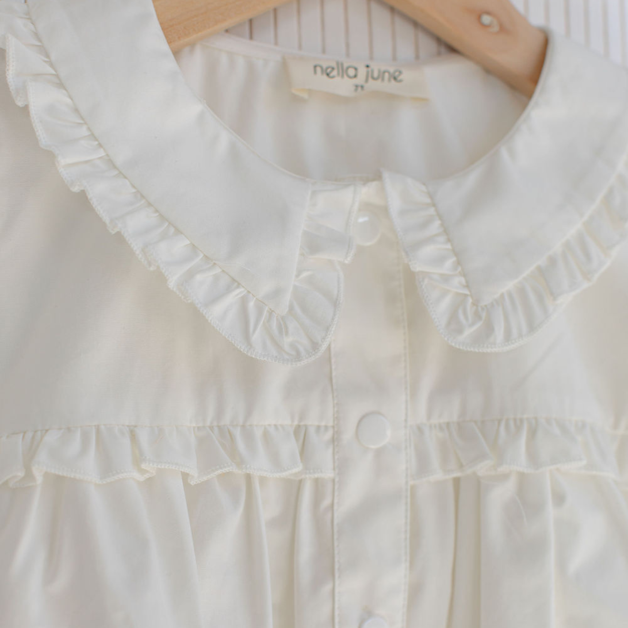 Available in 3 fun prints and a classic white, this blouse features ruffle trim along the collar, long sleeves and snaps on the front to create a timeless look for your little one.
