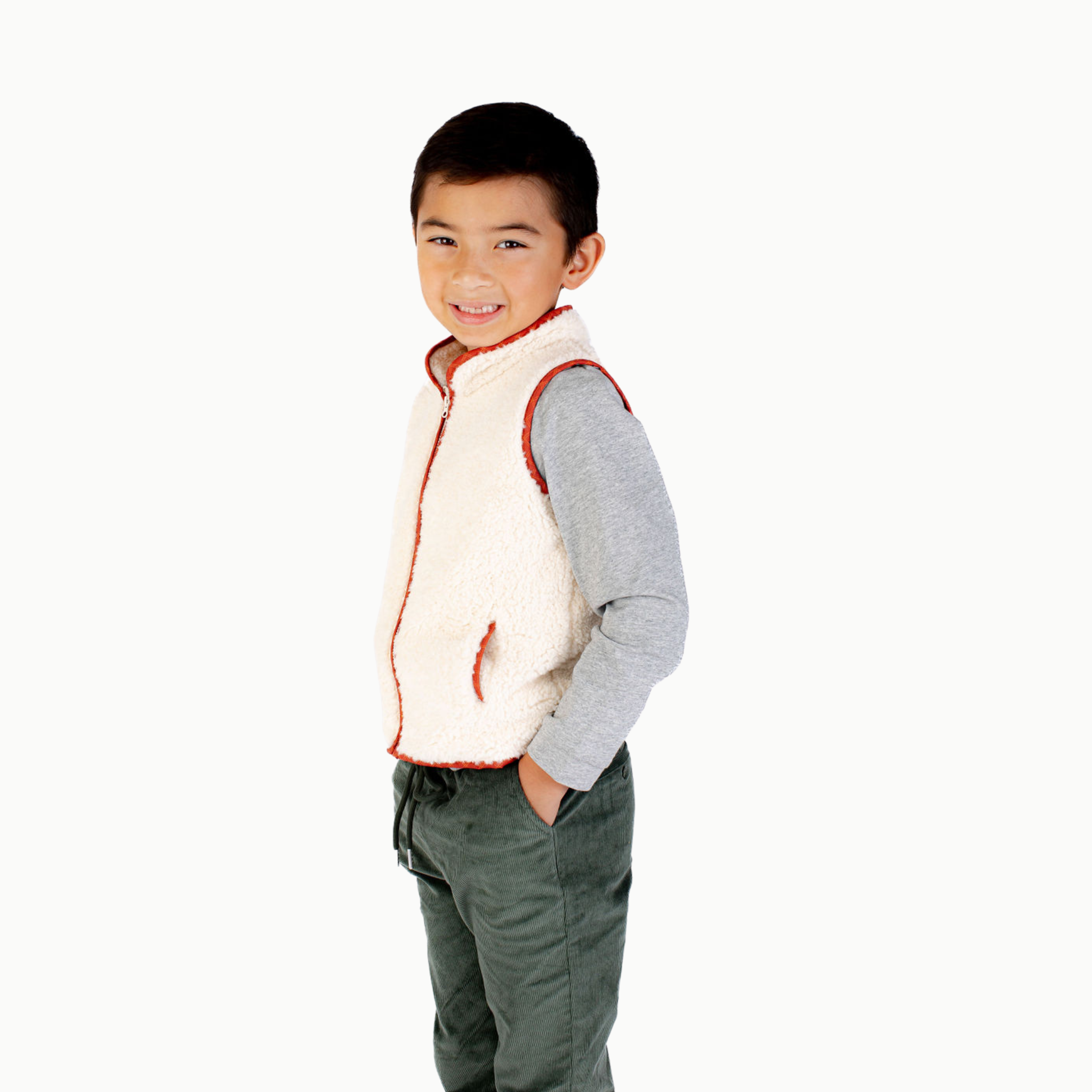 Comfortable, lightweight sherpa makes this vest easy to layer with one of our Henley's or Button Downs, and Dino Print piping sets our Boys' Sherpa Vest apart to make it the perfect addition to your little guy's fall wardrobe.